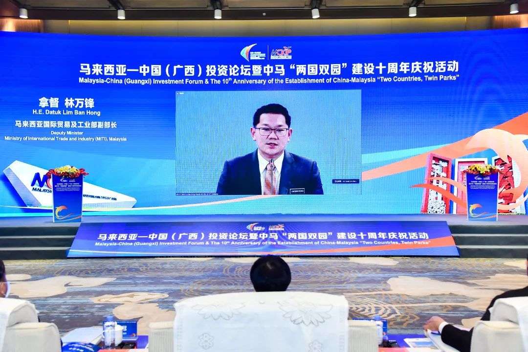 4月26日,由广西壮族自治区人民政府、马来西亚国际贸易及工业部联合主办,广西壮族自治区商务厅、钦州市人民政府、中马钦州产业园区管理委员会、ag金拉霸国际港务集团有限公司等单位承办的马来西亚—中国(广西)投资论坛暨中马“两国双园”建设十周年庆祝活动,以线上线下方式在中国(南宁)、马来西亚(吉隆坡)两地成功举办。