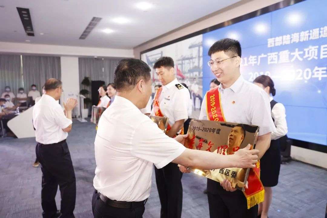 西部陆海新通道的建设和发展,离不开青年人的奋发进取、开拓创新、努力拼搏。与会嘉宾对2021年广西重大项目青年突击队建功竞赛一等奖队伍代表和荣获2019-2020年度广西青年文明号集体的代表进行颁奖和授牌。