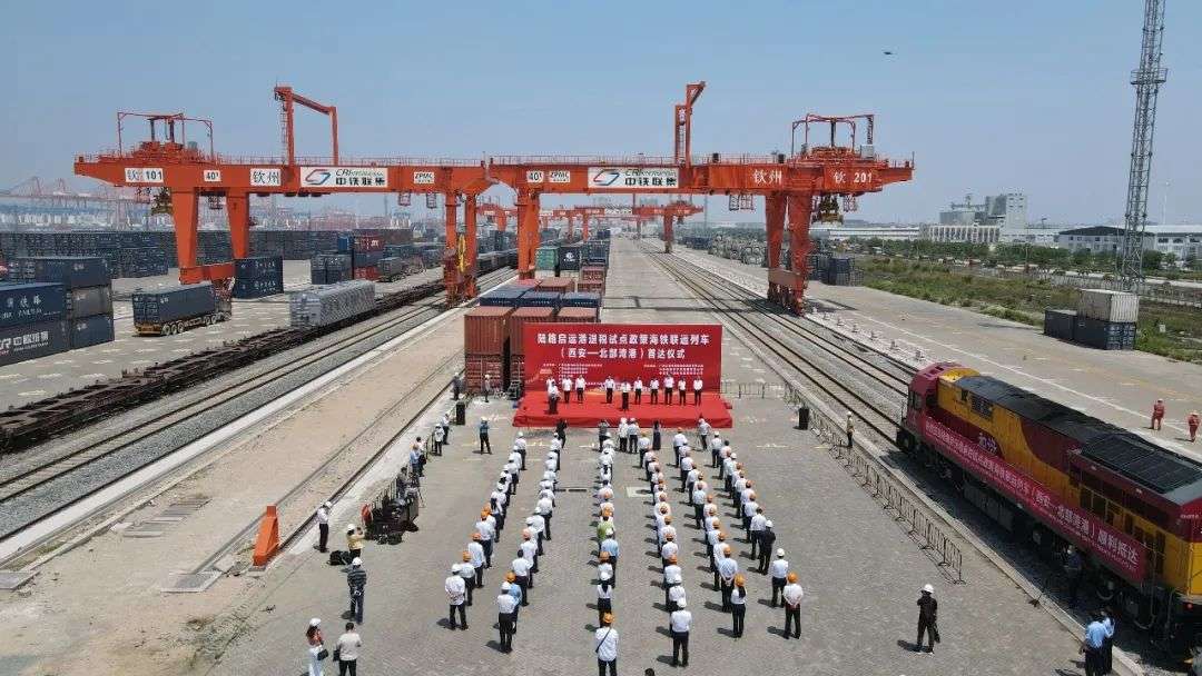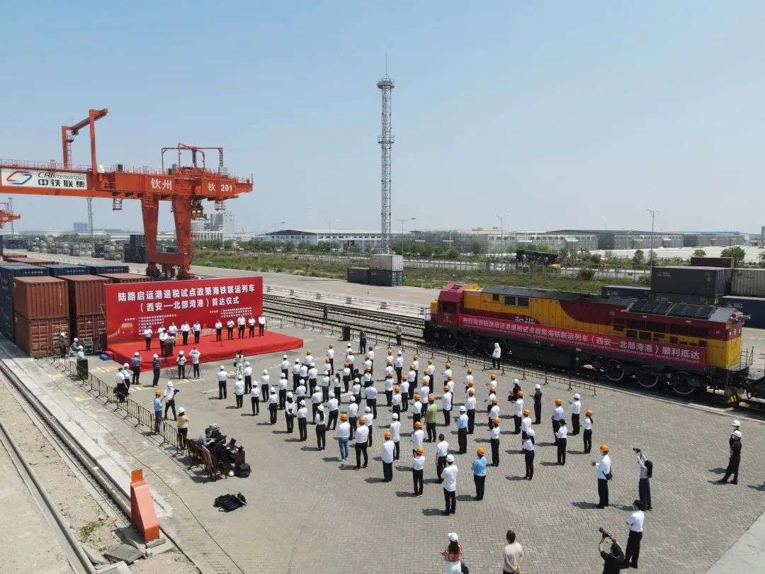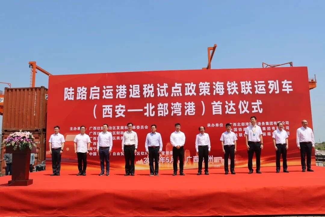 当天,“陆路启运港退税试点政策海铁联运班列(西安—北部湾港)首达仪式”在钦州举行,自治区发展改革委党组成员樊一江主持仪式,自治区财政厅、交通运输厅、商务厅、北部湾办,广西税务局、南宁海关,自贸试验区钦州港片区管委会,中国铁路南宁局集团、北部湾港集团、中铁联合国际集装箱广西有限公司等单位相关负责同志及企业代表出席活动。