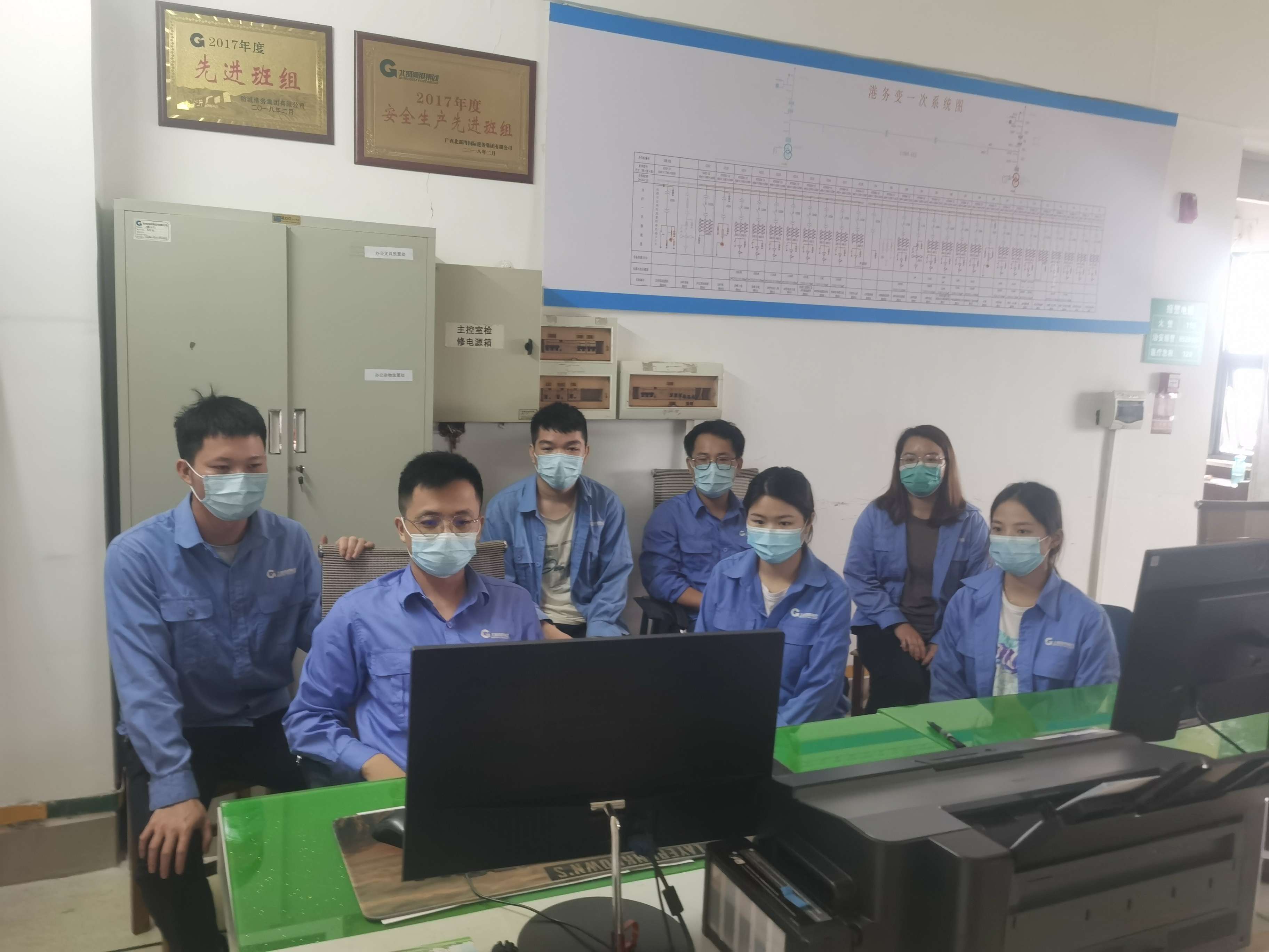 防港集团北海铁山港分公司组织110kV港务变电站主控室值班青年团员观看直播。