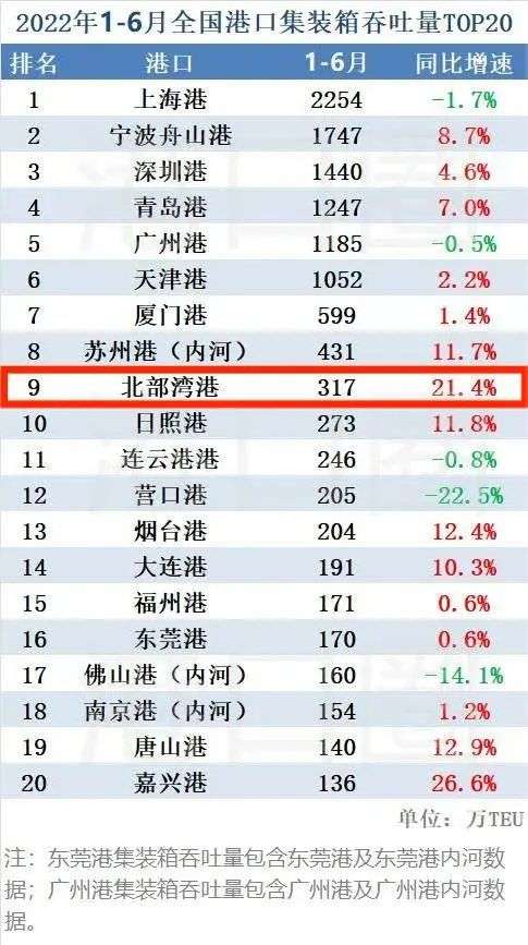然而从上半年集装箱吞吐量同比增长来看,前十大港口中,也有8个港口实现同比正增长,其中北部湾港同比增长21.4%。
