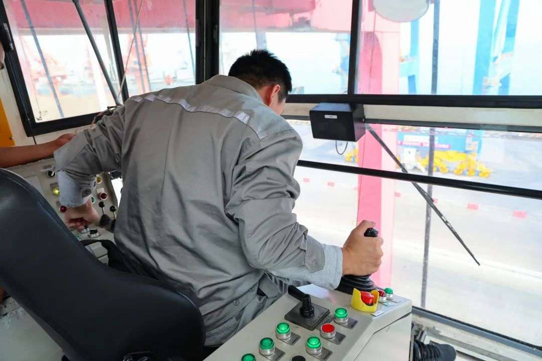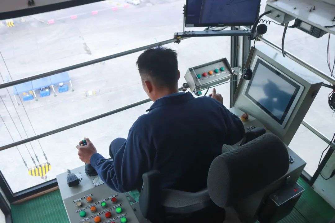 在岸桥项目中,选手们控制40尺集装箱在规定的狭窄区域内快速、轻盈地完成升降、抓取、撞击、到达指定区域等步骤,考验的是北港工匠们对大型生产设备、吊具及其运行位置稳定性、精准度的强大控制能力。