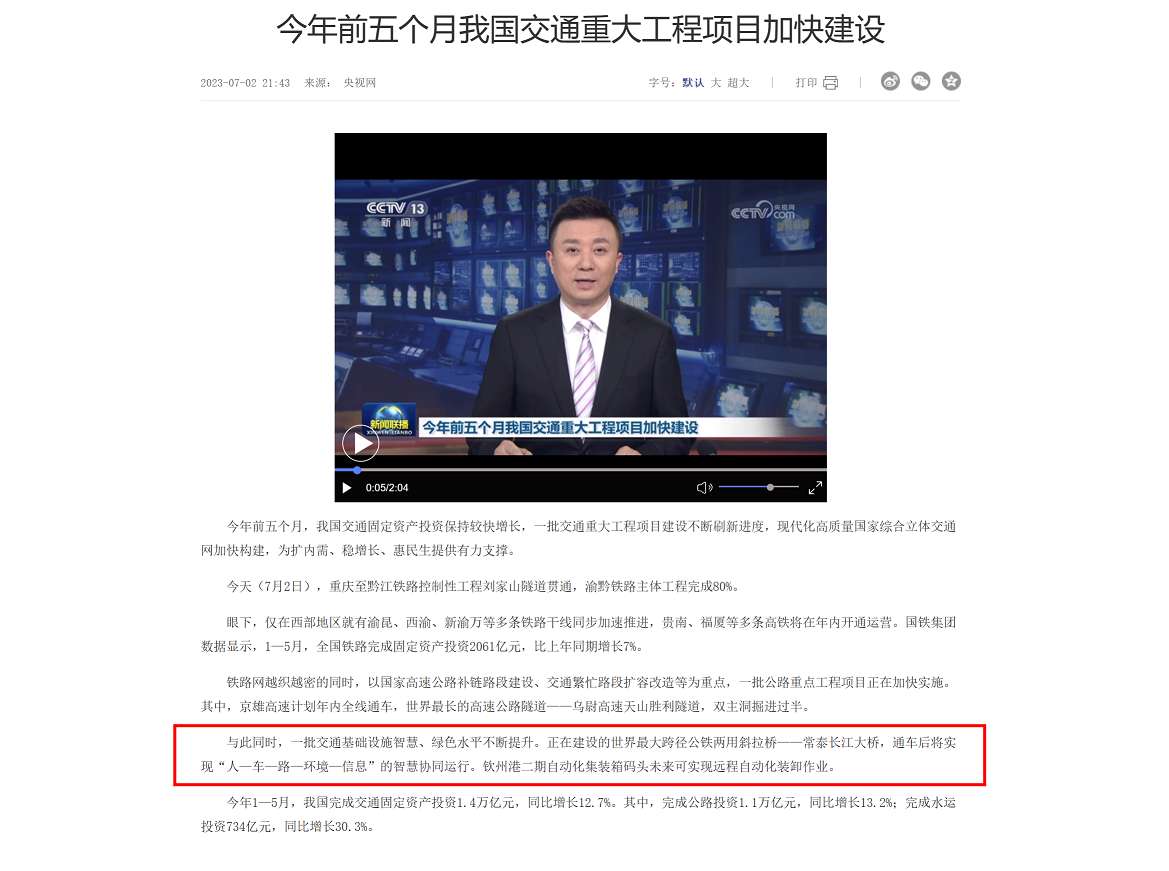 7月2日,《新闻联播》强势关注今年前五个月我国交通重大工程项目加快建设情况,钦州港自动化码头二期建设作为全国交通重大工程项目建设之一,霸气登场、备受关注!
