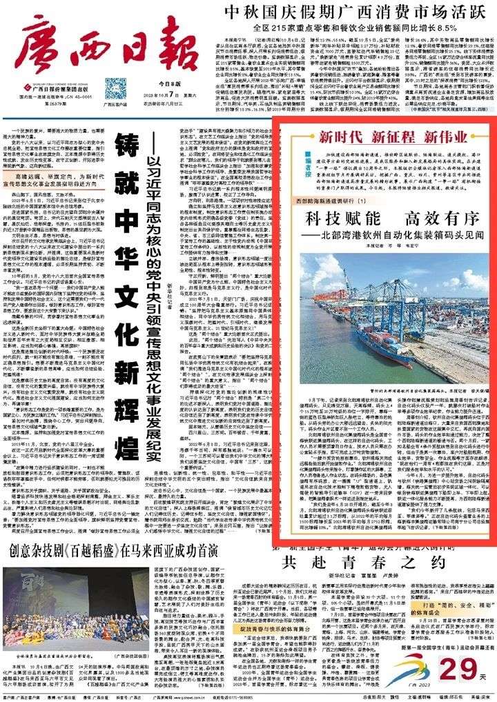 在共建“一带一路”倡议提出10周年之际,广西主流媒体组织全媒体记者深入西部陆海新通道重要枢纽节点开展调研采访。近日(10月7日),《广西日报》头版刊发了《西部陆海新通道调研行(1)科技赋能 高效有序——北部湾港钦州自动化集装箱码头见闻》,揭秘北部湾港如何用科技赋能,为西部陆海新通道建设提供了强力支撑。